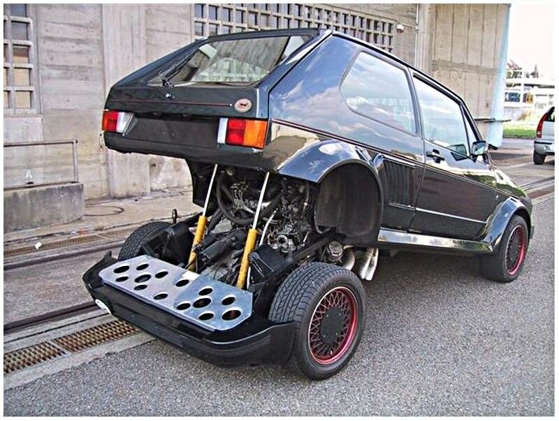 9. Volkswagen Golf с центральным расположением двигателя. Владелец первого поколения Golf решил кардинально модернизировать хэтчбек, установив пневматическую подвеску и перенеся силовой агрегат в середину кузова. Такая компоновка, характерная для суперкаров, теоретически упрощает обслуживание и, безусловно, превращает автомобиль в эффектный объект для демонстрации.